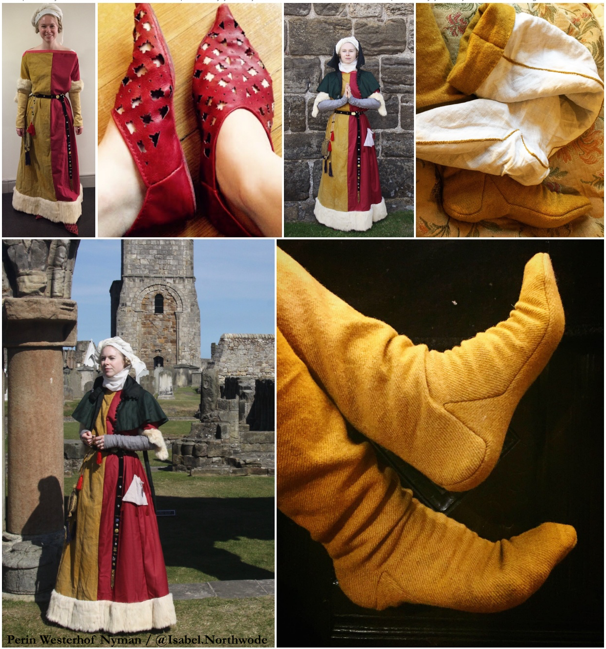 Hand-stitched wool gown with vintage rabbit fur trim and silk ribbon at neckline (red side commercially dyed; yellow side naturally dyed in onion skins); hand-stitched grey linen kirtle with self buttons; hand-stitched green wool liripipe hood with linen lining and self buttons; hand-stitched black velvet belt; hand-stitched silk wimple and veil; hand-stitched wool twill hose with linen lining (wool dyed in onion skins); hand-stitched wool purse (wool hand-woven in pavy weave on counterbalance floor loom); hand-stitched and hand-cut red leather shoes