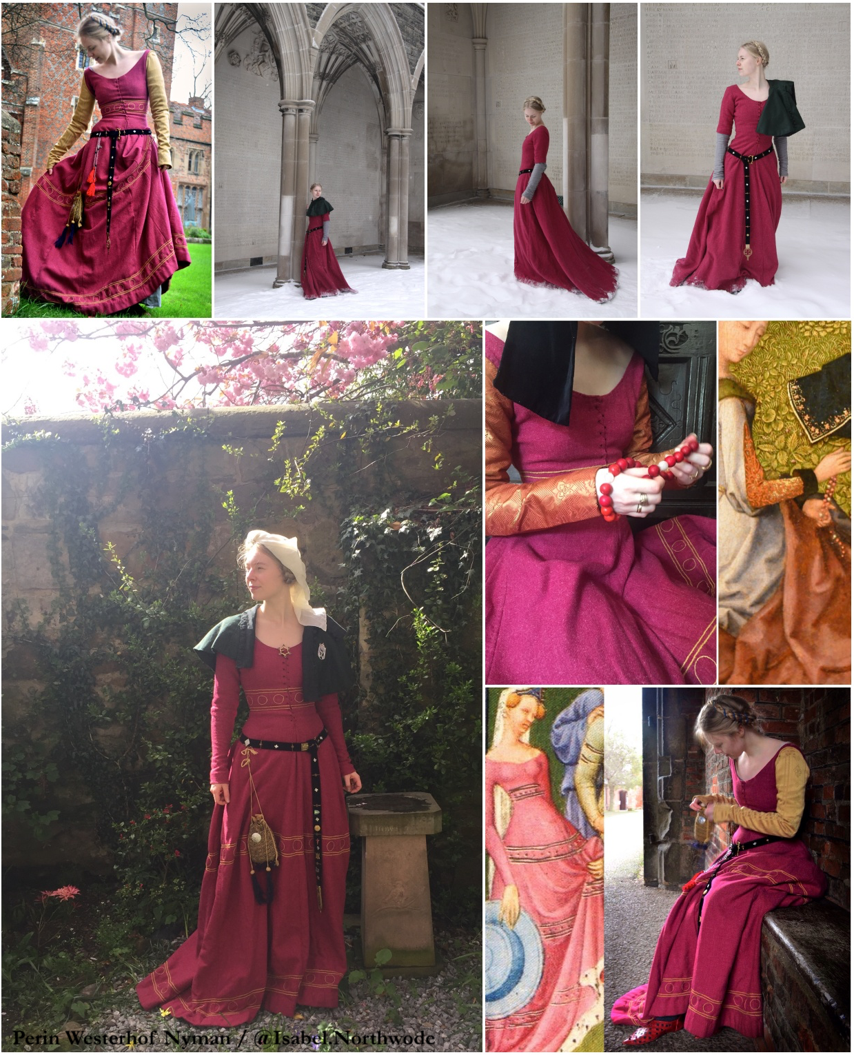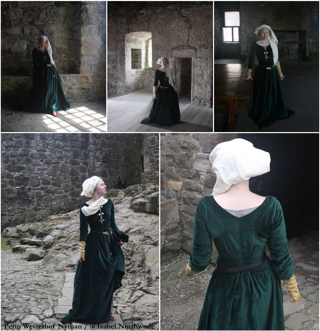 Hand-stitched worsted wool gown stiffened with linen canvas and lined with salvaged vintage fur; hand-stitched woollen kirtle stiffened with linen canvas and trimmed with silk velvet; hand-stitched wool hose; hand-stitched wool partlet; hand-stitched silk brocade sleeves; hand-stitched and embroidered coifs and hood; hand-stitched silk belt