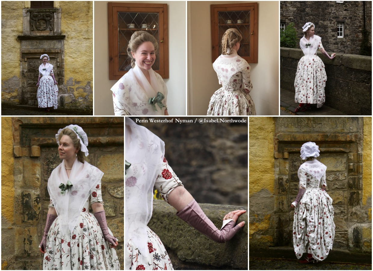 Made while representing a stitcher in the Margaret Hunter Millinery and Matuamaking Shop at Colonial Williamsburg, VA in 2015; updated to wear at the public ‘Wedding Gown in a Weekend’ demonstration presented at National Museums Scotland in 2019