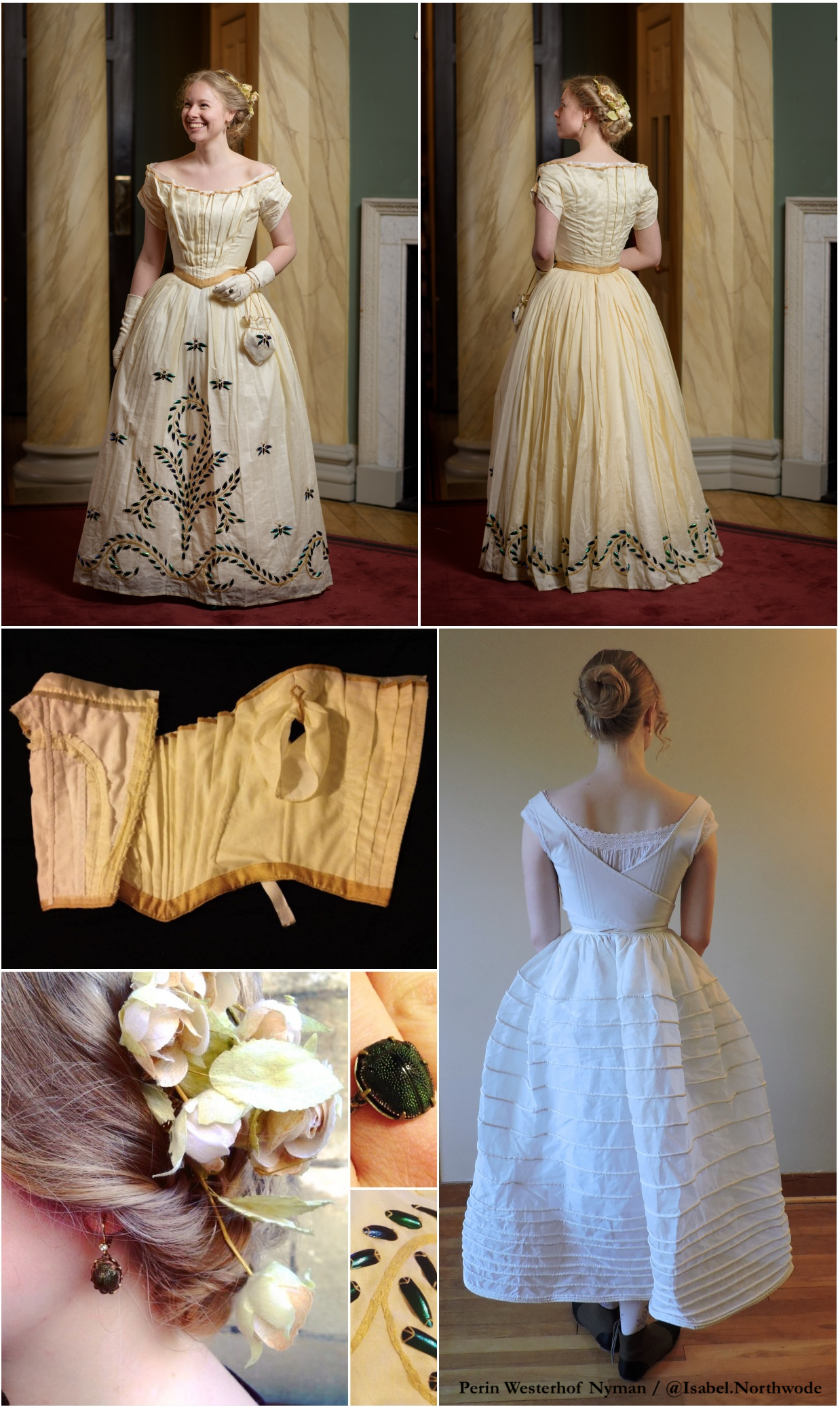 Hand-stitched ivory cotton muslin bodice with white cotton lining, plastic whalebone waist stays, cotton cording, and gold organza trim; hand-stitched ivory cotton muslin skirt, hand-embroidered with real beetle elytra and gold silk floss; hand-stitched green silk and leather dancing slippers; worn over hand-stitched cotton organdy corded petticoat; purchased reproduction scarab earrings; vintage kid gloves and antique real scarab ring