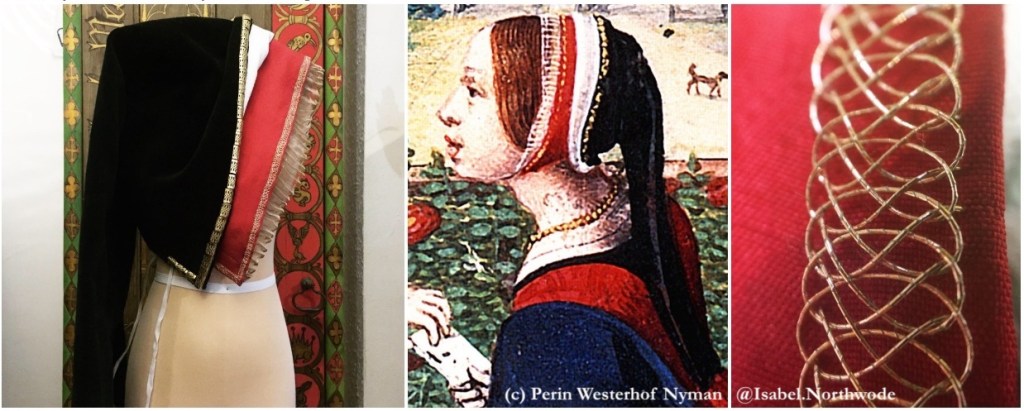 Hand-stitched linen coif with cartridge-pleated gold silk organza edging; hand-stitched red silk habotai ‘schaffron’ coif with gold plaited stitch embroidery; hand-stitched black cotton velvet hood with white ribbed silk lining and brass bead edging.